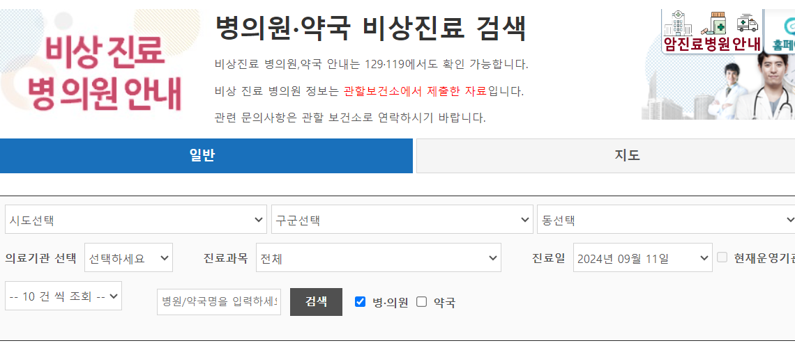 응급의료 포털 웹사이트(www.e-gen.or.kr ) 또는 앱에서 검색하거나 119(severe 응급환자), 129(mildly 병), 120(지역번호)에서 찾을 수 있습니다.