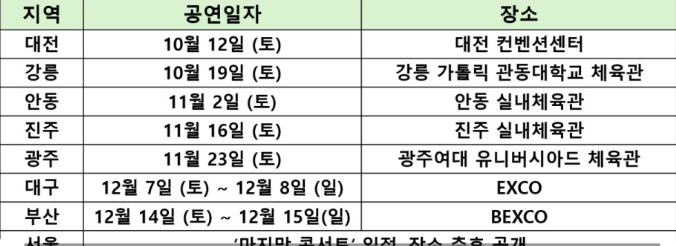 하반기 콘서트 10월12일 대전에서부터 강릉, 안동, 진주, 광주, 대구, 부산, 그리고 서울에서 마지막 콘서트가