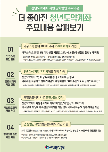 기존에 가구 중위소득 180% 에서 250% 이하로 개선이 되어 가입을 할수 있는 가구들이 중가를 하게 되었습니다. 연령층은 충족이 되었지만, 소득기준이 부합되지 않으셨던 분들이라면 이용이 가능할것 같습니다.