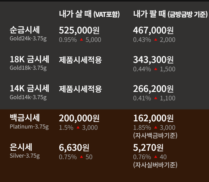 2024년 10월26일 기준, 국내 금시세는 순금 한돈 (24k, 3.75g)의 경우 내가 살때 구매 가격이 약 525,000원이며, 내가 팔때는 467,000원에 거래되고 있습니다. 살때와 팔때 모두 어제보다 오늘 가격입니다. 가격은 실시간으로 변동이 있으니 참고 하시기 바랍니다.